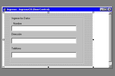 Ya hemos hecho la primera parte, que es el diseño de la interfase que verá el usuario, ahora nos falta darle propiedades y métodos a nuestro control. Para no alargar mucho el asunto le daremos una sola propiedad llamada strSalida que almacenará los datos ingresados en un string con campos de largo fijo: 30 para el nombre, 30 para la dirección y 10 para el teléfono El primer paso es elegir Archivo, Nuevo Proyecto, Control ActiveX, aparecerá una pantalla similar a un form pero sin bordes Luego cambiamos la propiedad del nombre de UserControl1 a IngresoCtl Elegimos Proyecto, Propiedades de Ingreso y cambiamos el nombre de Proyecto1 a (por ejemplo) Ingreso, la propiedad Public debe ponerse en True. Cerramos la ventana de propiedades del proyecto Agregamos un frame (marco de fondo) y los tres textbox a los cuales les ponemos los nombres de txtTexto1, txtTexto2 y txtTexto3 respectivamente (por si no lo habían notado antes, la ventaja de definir nombres con mayúsculas y minúsculas combinadas es que después seguimos escribiendo los nombres en minúsula y si no cambia la caja nos damos cuenta inmediatamente que escribimos mal el nombre) Después agregamos los lbl1, lbl2 y lbl3 con los valores caption correspondientes y grabamos