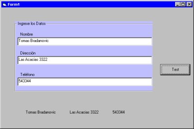 Por ejemplo podría agregar propiedades al control para cambiar el título del frame y los caption de las label que van arriba de cada textbox. Así el control me serviría no solo para ingresar nombre, dirección y teléfono sino que podríamos usar otros rótulos cualquiera, para esto escribimos en el control los siguientes procedimientos: Public Property Let Titulo(tit) También podemos definir una propiedad de salida, es decir algo que haga el control con los datos ingresados, en este caso haremos un solo string con los tres ingresos dejándolos de largo fijo con 30, 30 y 15 caracteres respectivamente, esto se puede hacer así Public Property Get StrSalida() As String El resultado será siempre un string de 75 caracteres de largo, los primeros 30 para el nombre, a partir del 31 con la dirección y desde el 61 irá el teléfono, lo que sobre se llenará con espacios en blanco (así se formaban los registros en los sistemas de archivo primitivo, puse el ejemplo de pura nostalgia) Ya estamos casi listos, solo falta dar unas "manitos de gato" para que nuestro primer control ocx nos quede operativamente decente, por eso agregamos código para que el foco se desplace hacia abajo cada vez que coloquemos Enter con Private Sub TxtTexto1_KeyPress(KeyAscii As Integer) Y finalmente colocamos un color de fondo mas resaltado, el control ocx está listo y nos ha quedado más o menos así: