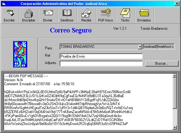 El programa cliente de correo SMTP está diseñado para encriptar y enviar mensajes seguros a través del correo electrónico. Para mayores antecedentes sobre la justificación del proyecto vea el documento Internet y los Problemas de Seguridad en Tribunales.
