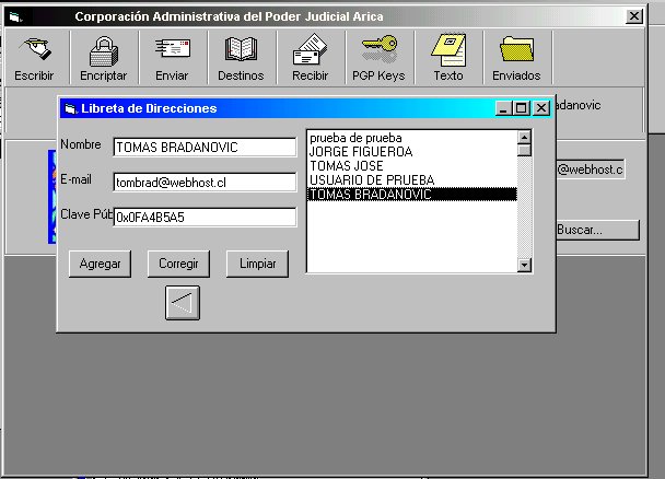 - Destinos: abre una libreta de direcciones editable donde se pueden agregar, corregir o borrar destinatarios de correo con sus respectivas claves públicas