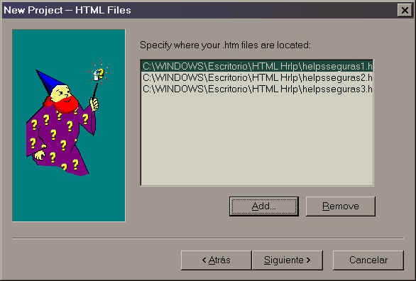- Luego chequeamos la opción HTML Files para agregar nuestras tres páginas HTML al proyecto, en este caso buscamos y marcamos las páginas llamadas helpsseguras1.htm, helpsseguras2.htm y helpsseguras3.htm y las agregamos al proyecto. Luego ponemos Finalizar